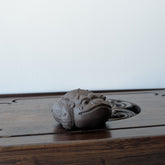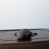 Фігурка чайного улюбленця у вигляді жабки створена з натуральної темної глини. Структура поверхні передає об’ємну фактуру шкіри, а виразна мордочка додає виробу характеру та особливої енергії для чайної церемонії. Коли поливати окропом під час заварювання, фігурка починає злегка блищати і набирає глибший колір.