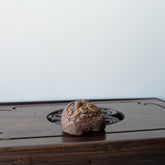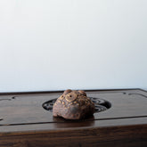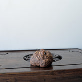Невелика глиняна фігурка жаби, виконана у стилі традиційних китайських чайних іграшок. Вона має округлу форму і виразну текстуру з дрібними опуклими деталями, що створюють ефект природної шкірки. Очі випуклі і блискучі, що додає фігурці живого характеру. Теплі коричневі відтінки глини та золотисті акценти підкреслюють ручну роботу і роблять виріб виразним на чайній дошці.