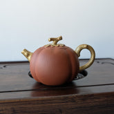 Ісинський чайник у формі стиглого гарбуза. Створений вручну з натуральної глини з декоративними елементами, що імітують натуральні гілочки. Кришка, носик і ручка мають фактуру природної кори, тому чайник виглядає як маленька мистецька скульптура.
