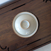 Гайвань у витонченому японському стилі з елементами кераміки Жу Яо. Світла глазур має характерну тонку сітку тріщин яка створює природний ефект старовинного фарфору. Теплий коричневий кант підкреслює форму і додає об’єму.