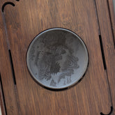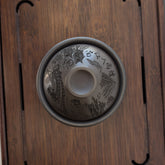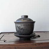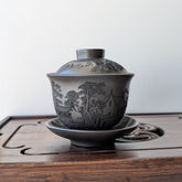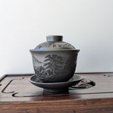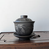 Елегантна гайвань об’ємом 200 мл, створена з темної кераміки високої щільності. Зовнішня поверхня прикрашена детальним ручним гравіюванням у традиційному китайському стилі. Пейзаж із храмами, мостами та гірськими лініями виглядає живим і глибоким завдяки тонкому рельєфу.