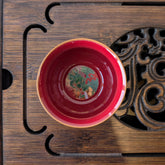 Яскрава піала з глибоким червоно-рубіновим покриттям усередині та розписом із зеленим драконом на зовнішній стороні. Золоті акценти й чорний фон створюють враження сили, руху та благородства у китайській традиції дракон символізує енергію «ці», владу і добробут.
