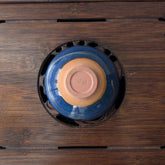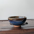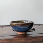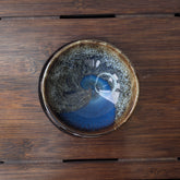 Глазурована піала з яскравими переходами синього, коричневого та сіро-золотистого тону. Усередині утворюється ефект глибокого вирію: темно-синій центр переходить у текстурні «хмарні» розводи по краях.