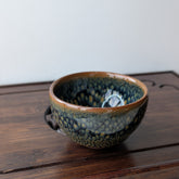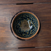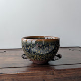 Піала з глибокою кристалічною глазур’ю, де візерунок нагадує дрібну луску чи пелюстки, що сходяться до центру. Поєднання зелених, синіх та жовтих відтінків створює ефект живої текстури, яка змінюється залежно від світла.