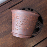 Ця піала виготовлена з природної червоної глини з темними вкрапленнями, що надають поверхні глибини та живої текстури. На стінках вручну вирізьблено каліграфічний напис у старому стилі — відсилання до давніх поетичних традицій Ісінської школи.