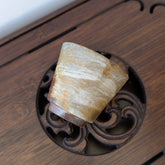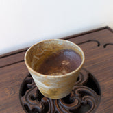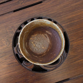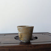 Піала з натуральною теракотовою фактурою та матовим попелясто-охристим покриттям, яке нагадує сліди піску, стерті вітром. Полива нанесена нерівномірно, з м’якими переходами від теплого коричневого до світло-сірого, створюючи ефект природного каменю або глини, що зістарилася під сонцем.