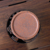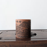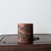 Груба текстура й глибоке гравіювання створюють відчуття старовини, а форма з прямими стінками додає стриманої величі. Така піала чудово зберігає температуру настою й підходить для темних чаїв - шу пуеру, люй ча високого обсмаження або зрілих улунів.
