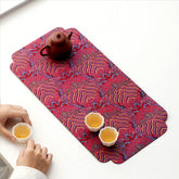 Вишуканий чайний раннер, який стане центральним акцентом чайної церемонії. Тканина прикрашена яскравим орнаментом у відтінках червоного, фіолетового та золотистого, що нагадує хвилі, хмарні узори та стародавні декоративні мотиви. Візерунок створює відчуття руху й глибини, надаючи чайному столу урочистості та витонченості.