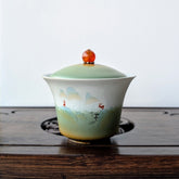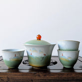 Витончений порцеляновий набір, що поєднує гайвань (140 мл) і три піали (50 мл), розписані вручну у традиційному стилі шань-шуй. На поверхні - спокійні зелені пагорби, туманні вершини та фігурки оленів, символів довголіття й гармонії.